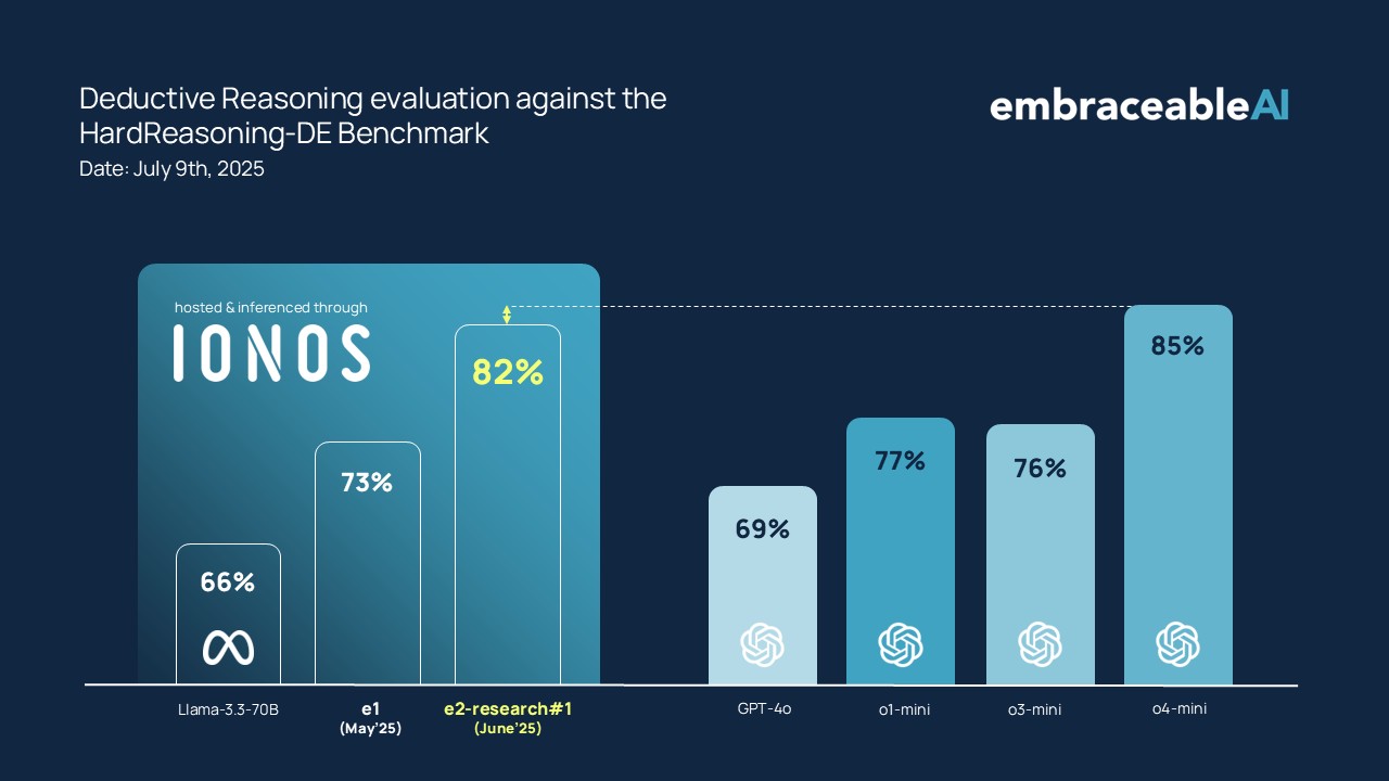 In der ersten Jahreshälfte 2025 haben wir mit e1 den ersten funktionalen Durchstich unserer neuen Basis-Architektur für Kognitives Reasoning präsentiert. Dafür haben wir erstmals ein Sprachmodell mit einer kognitiven Steuerungskomponente zu einem so genannten „Kognitiven System“ erweitert. Bereits e1 zeigte eindrucksvoll, dass deduktives Denken und rekonstruierbare Argumentationspfade auch im Rahmen maschineller Textverarbeitung und -Generierung beherrschbar werden – ein wegweisender Schritt in Richtung steuerbarer, erklärbarer und gleichzeitig leistungsstarker KI.